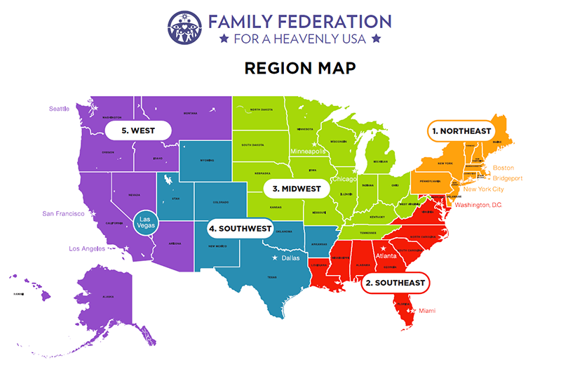 In order to progress toward fulfillment of Vision 2020, True Mother restructured FFWPU USA into five subregions and appointed subregional directors for the subregions during a visit to the U.S. on December 21, 2017. She subsequently restructured Korea and Japan into five subregions. True Mother’s intention was that the three providential nations “unite under one system, one organization, and help one another advance” towards the goal of national restoration. She spoke of revealing “a Family Federation for a Heavenly Korea, for a Heavenly America, and for a Heavenly Japan whose members have been successful as Heavenly Tribal Messiahs to the world.” The Family Federation for a Heavenly America as a continental region was restructured into Northeast, Southeast, Midwest, Southwest, and Western subregions.