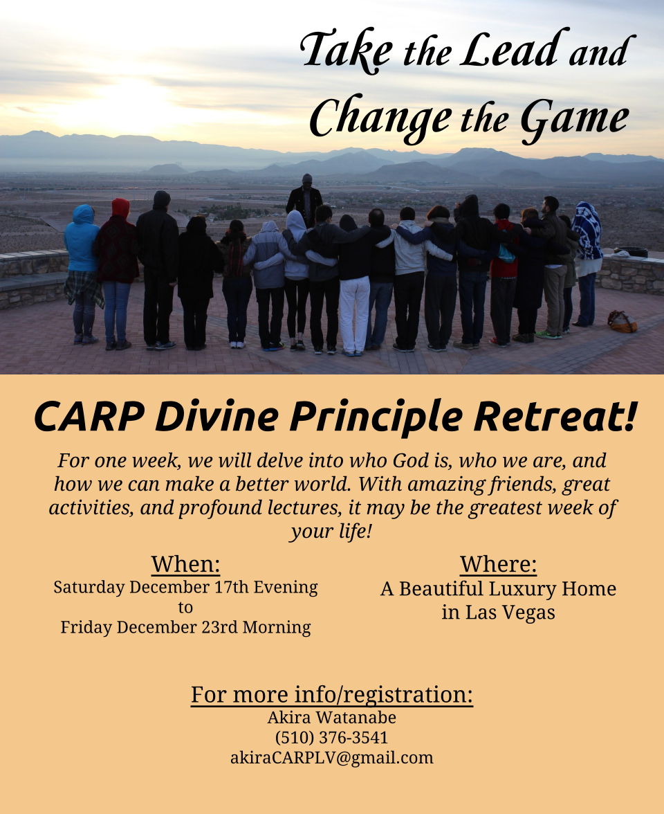 Are you a college student searching for something deeper in your life? Do you want to join other like-minded young people as you explore questions of faith? Then come to the CARP DP Workshop! From December 17–23, CARP Las Vegas will hold a five-day workshop to study Divine Principle, the core teachings of the Unification movement. Join the fun at a luxurious vacation home in Las Vegas, where we will examine who God is, who we are, and how we can make a better world. This is YOUR breakthrough opportunity, whether you are new to Divine Principle or well-experienced.