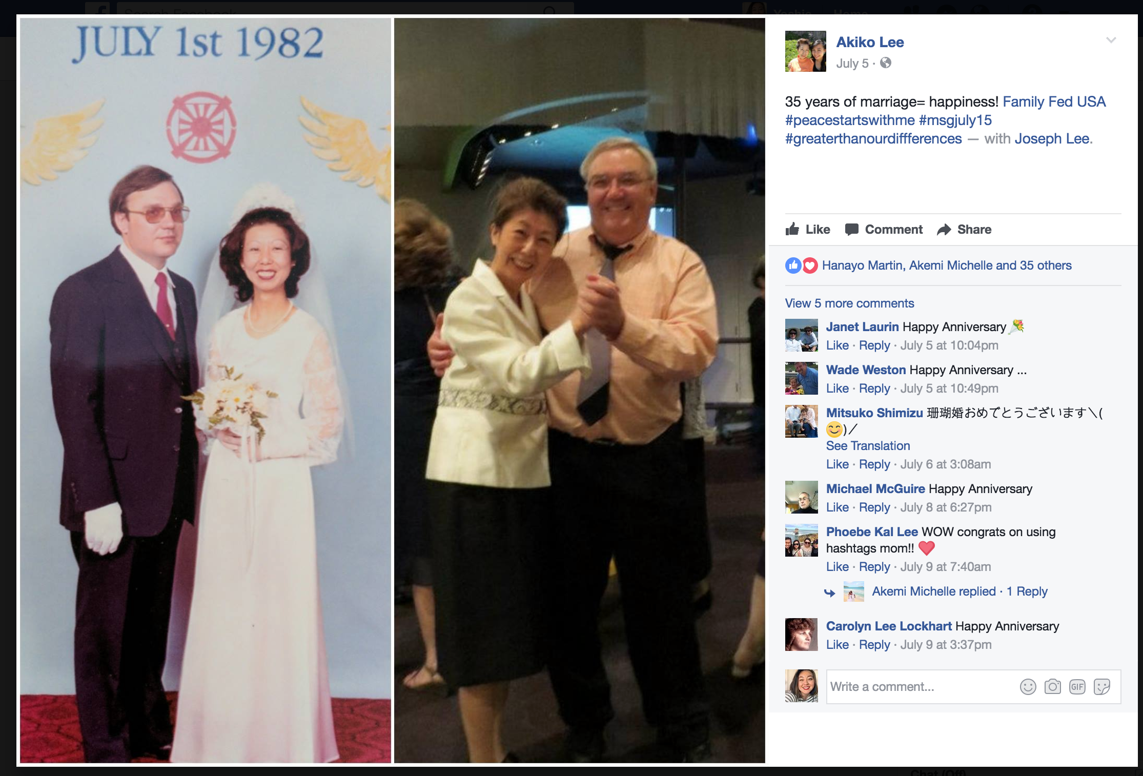 To celebrate 35 years of marriage for the participants of the 1982 Holy Marriage Blessing Ceremony at Madison Square Garden, we invited the 2,075 couples to join a contest and earn a chance at winning a free trip to Hawaii, as well as other great prizes. The couples were asked to post pictures of themselves on Facebook or Instagram at the Blessing Ceremony and present day. The video above shows all the entries among the 2,075 couples, then and now, and the lucky winners can be found below!