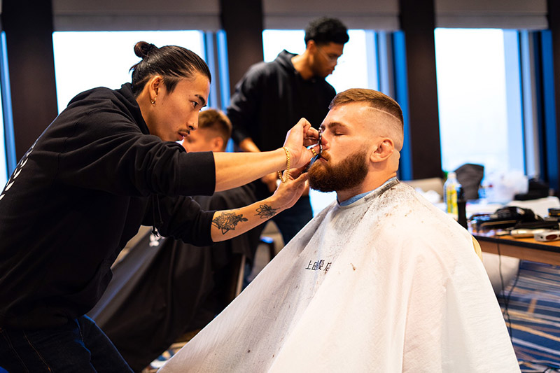 While in Japan, this past September 2019, Noritaka’s barbershop was contacted by one of England’s professional rugby players about four national rugby teams—Australia, Tonga, Fiji and England—looking for an English-speaking barber in Japan to cut their hair for their first rugby matches at the Sapporo Dome. Noritaka was the only one who spoke English and immediately agreed.